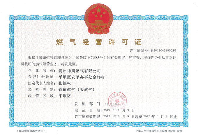 三是全资子公司余庆县神州燃气有限公司拥有的《燃气经营许可证》(许可证编号为:021914001),主要经营贵州省余庆县城及部分乡镇天然气供应;