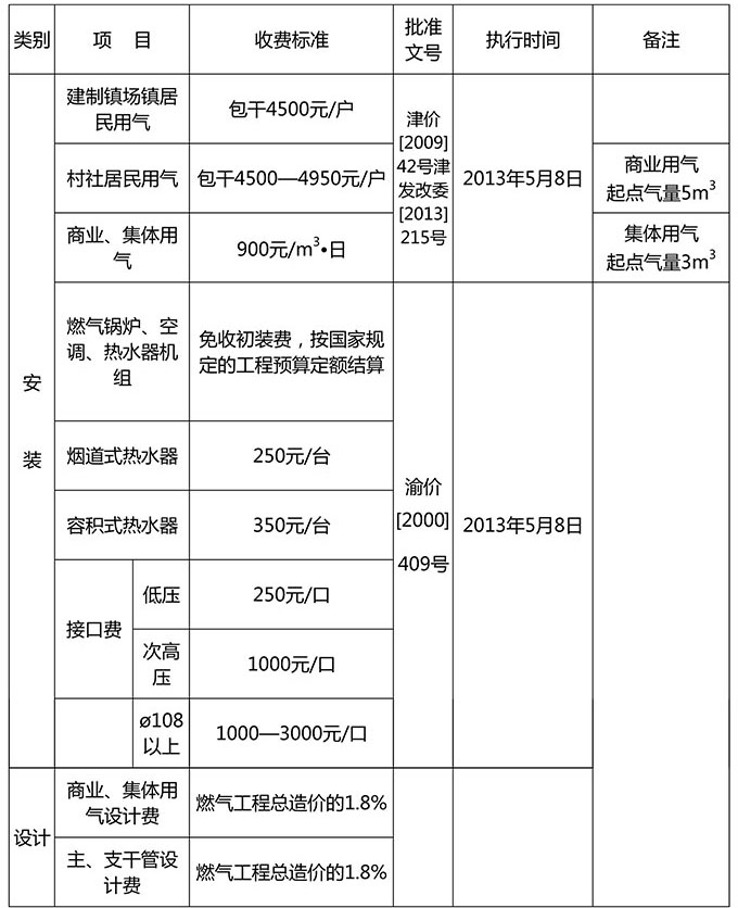 燃气工程安装收费标准(重庆神州天然气有限公司)